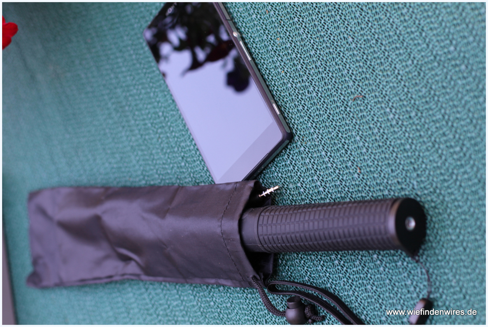 Das Material ist Aluminium, der Griff ist gummiert und antirutschsicher. Er liegt sehr gut in der Hand. Unten befindet sich noch ein Stativgewinde, das finde ich sehr positiv, so kann man also in luftiger Höhe auch wackelfreie Fotos schießen und Filme drehen (vielleicht bei einem Konzert, indem man die ausgefahrene Selfie Stange auf ein Einbeinstativ schraubt, erspart einem das ewige Arme hochhalten).